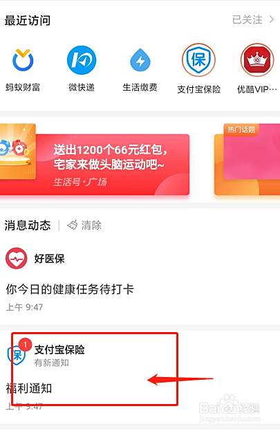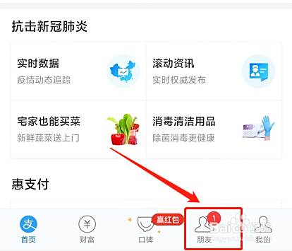 打开支付宝,点击带有消息提示的“朋友”