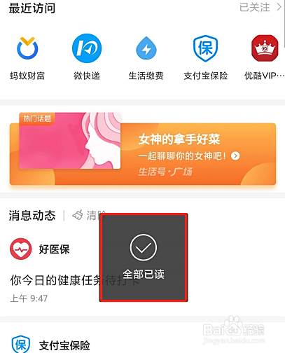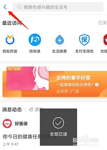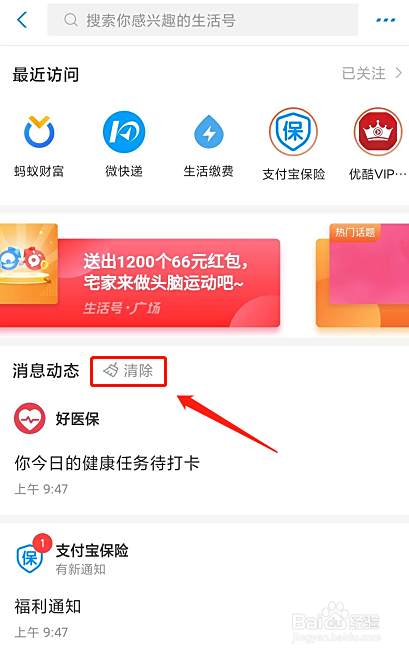 支付宝常用支付软件,里面也会有很多其他的服务 ,经常关注后会有很多消息通知,对于强迫症的人,会要全部消除,如何一次全部消除信息呢,很简单~