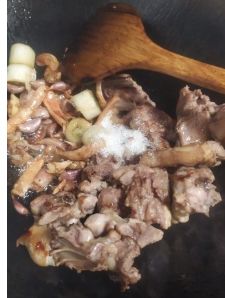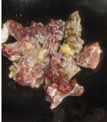 鸭肉入锅煎。
