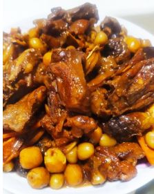 鸭肉斩件,干尤鱼切条。