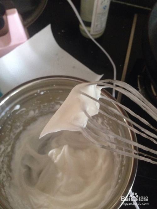 大约六分钟左右,过程中分三次加入糖,打发完毕,这是我的效果。