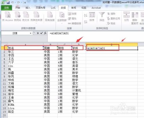 前面介绍的是分列的操作,那么如何将多列的数据合并成一列显示。我们可以在要进行合并的列用公式:=A1&B1&C1&D1来关联所有列的数据。因为这里都是字符所以公式比较简单。当然如果包含复杂数据的我们可以添加单引号来处理