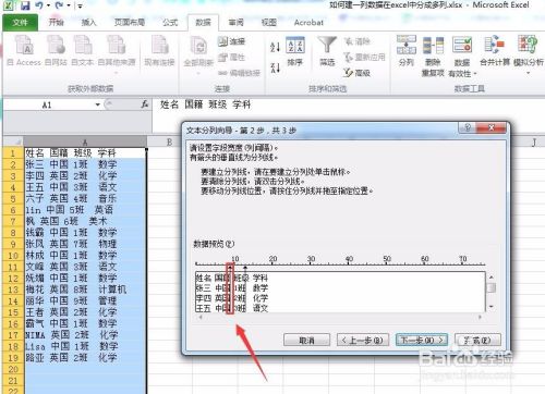 固定宽度:这里我们可以看到其中有箭头编制可以移动它,标记不同的宽度位置进行分列操作,例如这里我移动到将前面的“姓名”和“国籍”一起作为一列处理,得到三列:“姓名国籍”、“班级”、“学科”。