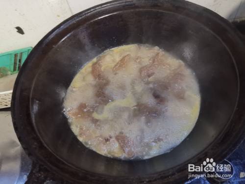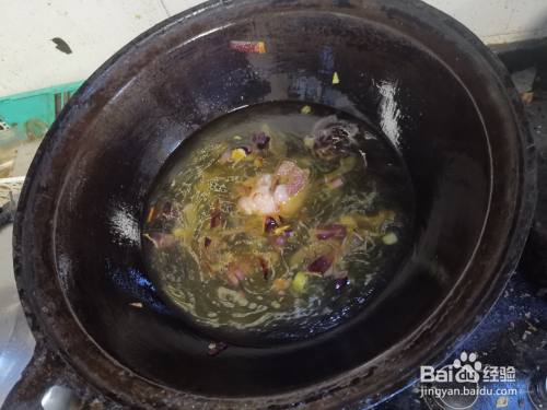 然后下入切成片的猪肉,在锅中翻炒出肉香味后,加入清水开始炖煮汤汁