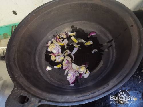 热锅冷油完成润锅后,下入食用油烧至5成油温后,下入切好的洋葱丁,炒出葱香味
