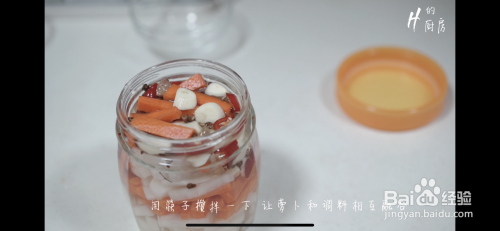 将萝卜一点点码入准备好的密封罐中,依次加入所有配料;