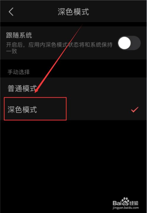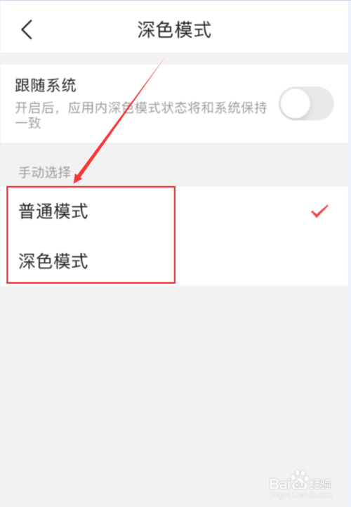 关闭“跟随系统”,在页面下方就能看到“普通模式”和“深色模式”。