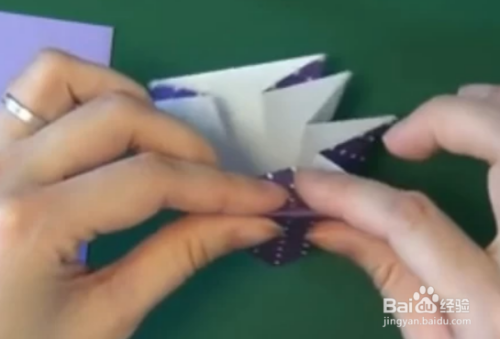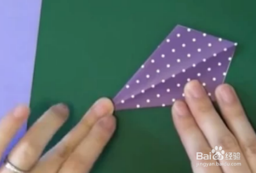 折完了的样子,仔细查看哦,没问题就进行下一步。将刚刚折下来的角翻到伞面内侧。
