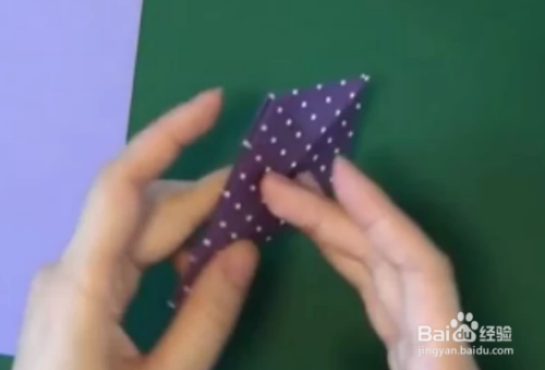将正方形的纸对折两次,折成小正方形。将上边的正方形,按图所示折成三角形。上下都要折,一共两次。