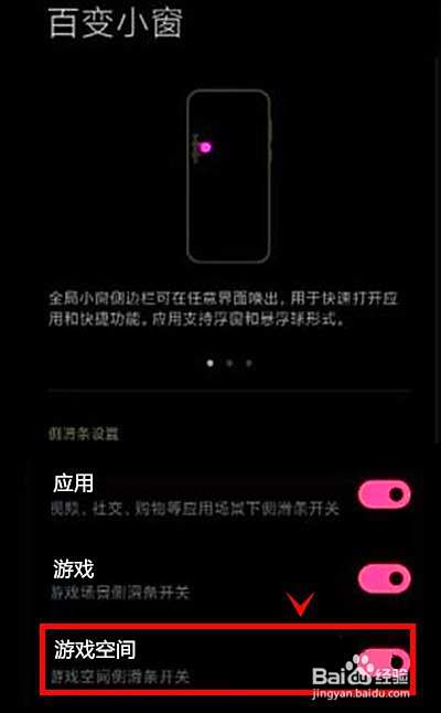进入【百变小窗】页面——开启【游戏空间】右侧的开关键即可。