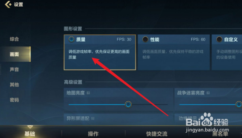 在画面设置可以看到现在的选项是质量,这个画质属于降低了游戏帧率,所以比较不流畅。