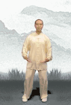 直立,并足,两膝挺伸、上身前俯,以两手攀握两足趾,头略昂起。然后恢复直立姿势,同时两手握拳,并抵于腰椎两侧,上身缓缓后仰,再恢复直立姿势。重复几遍。本式采用自然呼吸。