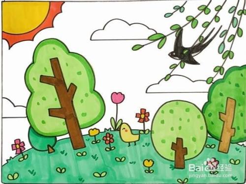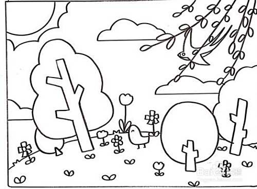 2接下来在图画纸上画出边框,在左上角画出太阳,右上角画柳树和飞翔的燕子,天空中画云朵,地上画花朵和小草。