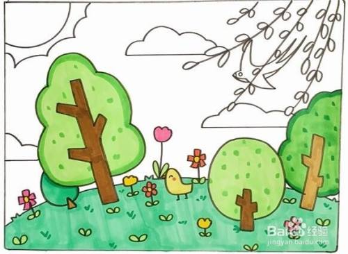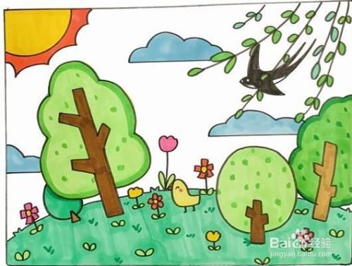 5最后把白云涂成蓝色,这样春天的画就画好了。  END END