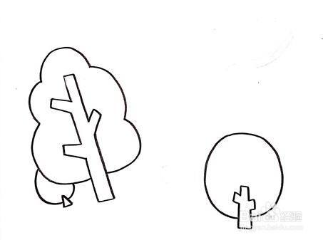 1首先在图画纸的左侧画一棵大树,在图画纸的右下角画一棵小树。
