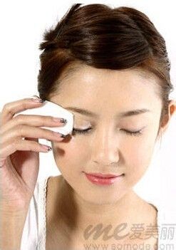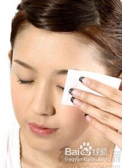 滴一点卸妆液到化妆棉上,然后闭上双眼,依眼皮的肌理,由眼头向眼尾方向慢慢抹去;抹下眼线位置时双眼向上望。尽量避免过度拉伸眼部肌肤产生细纹
