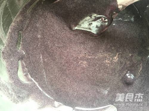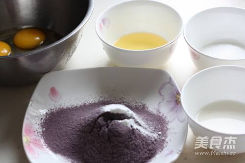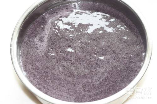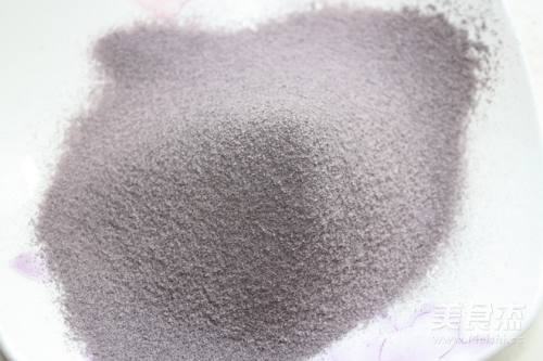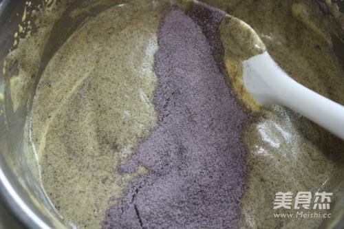 5黑米粉和泡打粉混合过筛后,分三次加入蛋糊中,每一次加粉后都先翻拌均匀再加入下一次