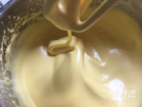 4鸡蛋打入盆中,加入细砂糖,用电动打蛋器中高速达到浓稠,滴落的蛋 液不会马上消失,再用低速略打30秒
