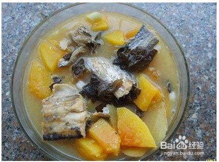 3、带鱼与木瓜入锅中加水同煮,鱼熟后加入酱油、醋、姜粒、葱花调味即成。
