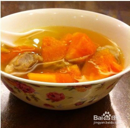 这是第一个使用木瓜的食谱,木瓜味道香甜,其中除了丰富的糖分外,还含有维生素A、B族维生素、维生素C以及铁、钙、有机酸、纤维素等营养成分。其中,β胡萝卜素和维生素C的含量特别高,后者是苹果的20倍,它们是天然的抗氧化剂,能有效地预防感冒,并阻止致癌物质亚硝胺的合成瓜蛋白酶是最好的蛋白质分解酶,可以帮助人体分解肉类蛋白质,助消化。含量丰富的木瓜酵素和维生素A能刺激女性荷尔蒙分泌,有助丰胸。
