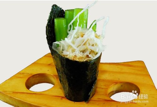 做法:将以上材料烫熟,放入紫菜中卷起。