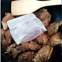 将香料放入无纺布袋中,加入热开水,没过牛仔骨,大火烧开后开小火慢炖1个半小时,至肉酥烂。
