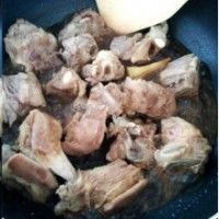 烧至8成热后倒入牛肋排,烹入料酒 撒少许冰糖,翻炒后再加入适量生抽,使牛肋骨上色。