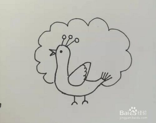 第七步,这里我们要画出孔雀开屏的尾巴,在孔雀的一边开始画,画波浪线,在孔雀的肚子部分结束,具体如下图所示。