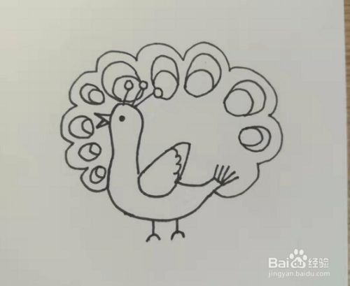 第六步,这里我们要画出孔雀的嘴巴,眼睛,在孔雀的头部画上一颗小黑点,这样眼睛就画好了,在孔雀的尾巴上画上几条短线,作为羽毛,如下图所示。
