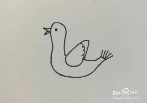 第五步,这里我们接着画出孔雀的尾巴,在刚刚画好的翅膀后面继续往后画,画一条曲线,具体如下图所示。