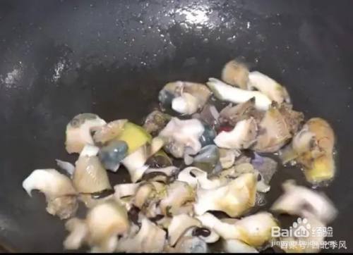 锅内倒入少许油,放入葱花炒香,放入海螺头爆炒3分钟。