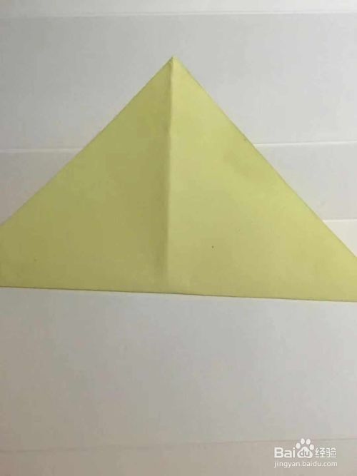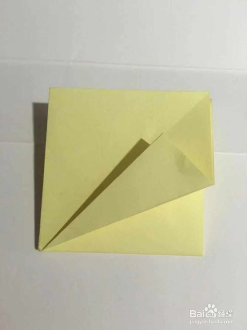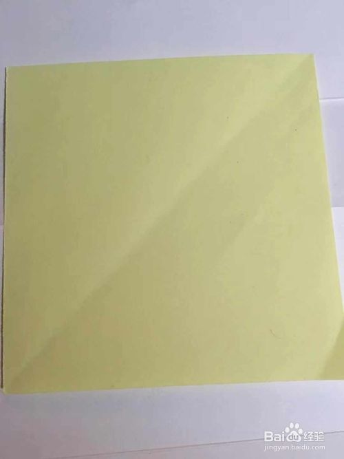 第一步 用16厘米长X16厘米宽的正方形黄色彩纸一张 把它从下向上对角折叠 然后取开 再把另一条对角线对折