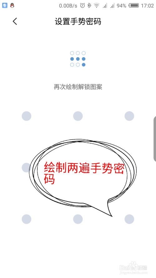 开启手势密码后,打开绘制手势密码的界面,绘制两遍一样的手势密码。如图所示