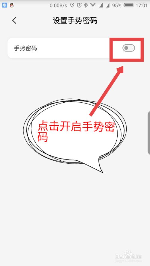 打开设置手势密码界面,先要点击手势密码后面的滑块,开启手势密码。如图所示