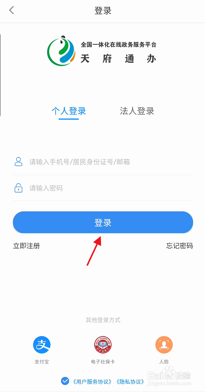 进入天府通办APP,输入相关账号信息,点击下方的登录