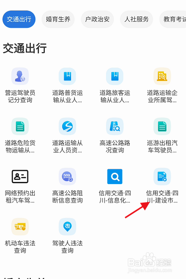 进入便民,选择交通出行,点击下方的四川建设市场信用查询