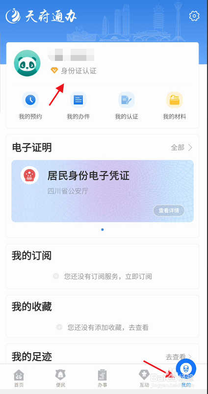 登录天府通办APP成功后,点击我的,点击我的认证,进行账号如果没有实名认证的需要实名认证(实名认证才可以办理相关的业务)