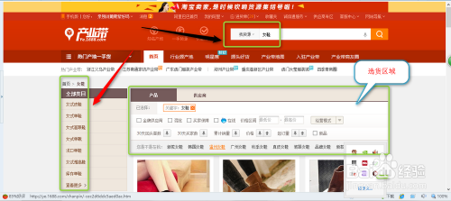 此外你还可以点击如第7步骤中图片所标注区域显示的货源直供,点击后出现如下图所显示的这样一个网页界面,在这个界面你也可以批发自己需要的商品。如果你想快速找到符合自己条件的商品,你也可以按下图中所标注的区域进行快速搜素哦。