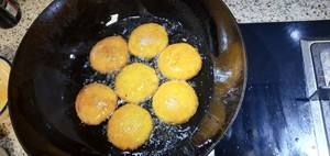 锅里倒油烧热后,加入地瓜饼,开小火慢慢炸,要不停地把地瓜饼翻转,以防炸烧焦。