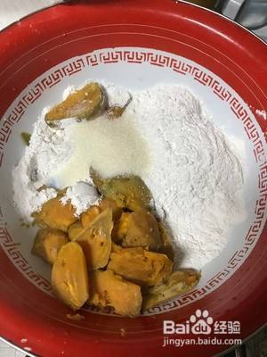 把蒸熟的地瓜倒入盆里,加入糯米粉和适量白糖,现在开始揉面。