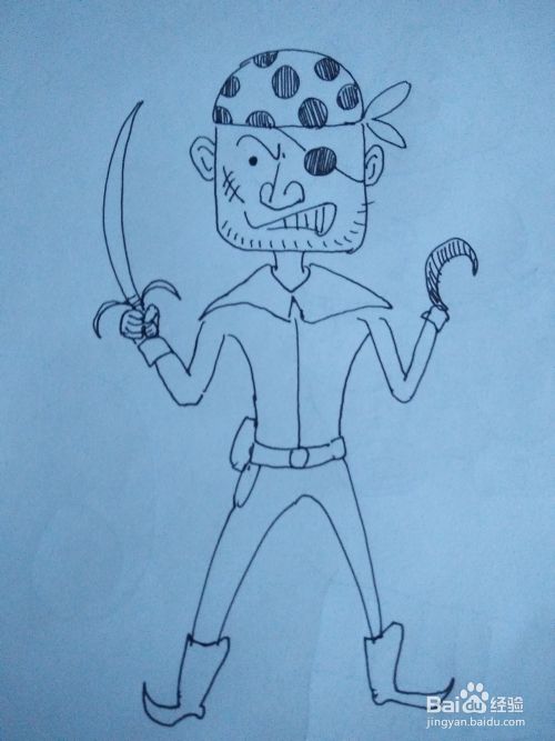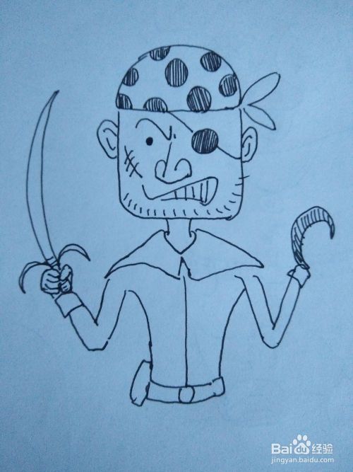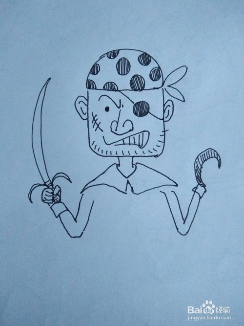 第四步画出独眼海盗的两只手臂,一只手拿着刀,一只手是弯钩。