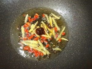 锅中入油烧热 爆香姜丝和小米辣 加入豆瓣酱翻炒香
