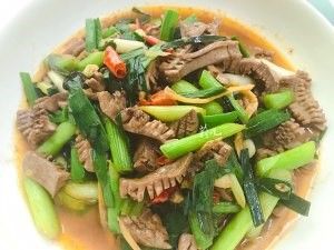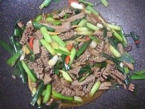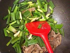 翻炒一分钟后加入蒜苗叶子 加入五香粉、鸡精、盐、生抽