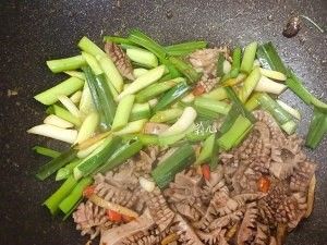 加入腰花 腰花炒至断生后加入蒜苗杆子