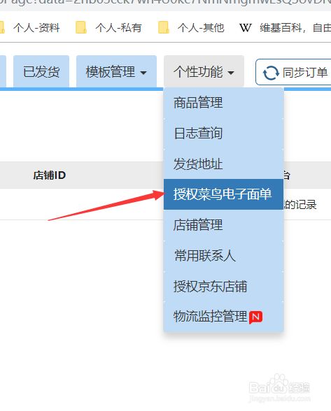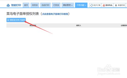 点击顶部菜单的个性功能,授权菜鸟电子面单,点击打开页面的授权电子面单按钮,进入授权页面,这里主要您要使用开通过电子面单的淘宝账号授权。