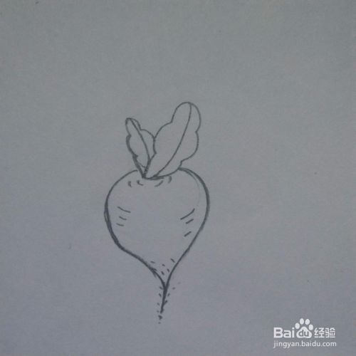 如图,画出红萝卜的整体轮廓,下面要尖尖的,还要加一根萝卜尾巴。