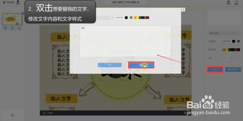 【修改文字】双击想要替换的文字,然后点击右栏中“修改文字”,修改文字内容、文字样式和文字颜色,最后点击确认,注意:更换字体的时候,要先下载再点击使用。