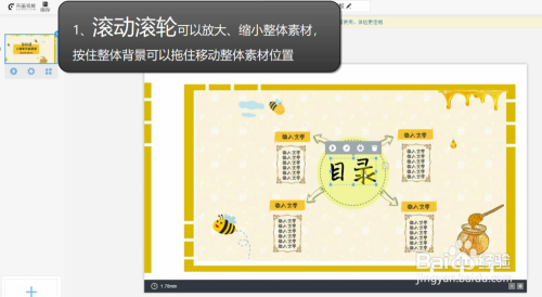 【浏览整体】滚动滚轮可以放大、缩小整体素材,按住整体背景可以拖住移动整体素材位置,也通过调整画布右下角的数值来缩小画布大小,大致浏览下模板内容和素材所在位置。