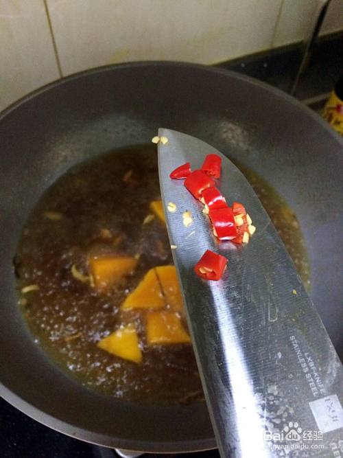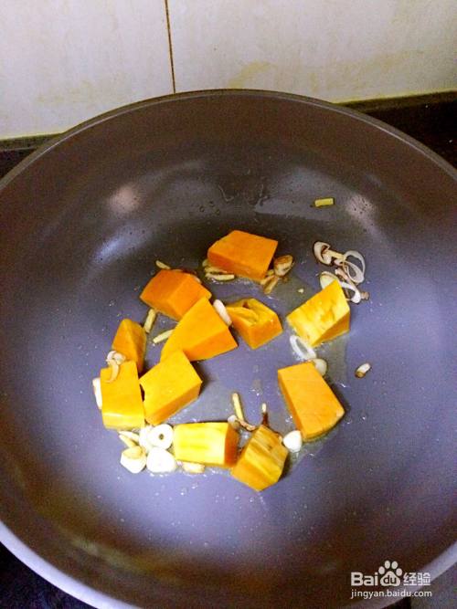 超出香味,倒入南瓜块翻炒一下,接着到少许酱油,一小勺盐。大概5,6分钟倒入清水即可,多莫过食材一些。中火煮开。