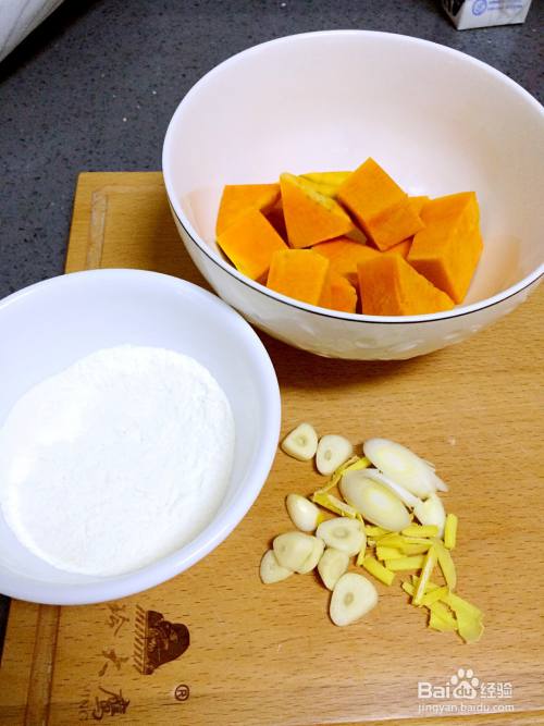 准备用料:葱姜蒜适量,不喜欢姜味的可以不用。南瓜切块。面粉小半碗